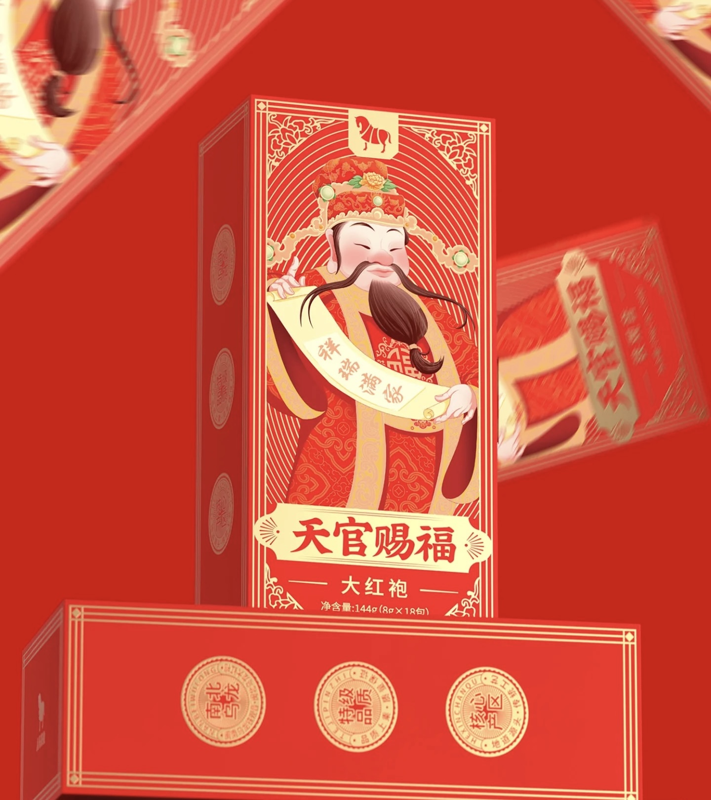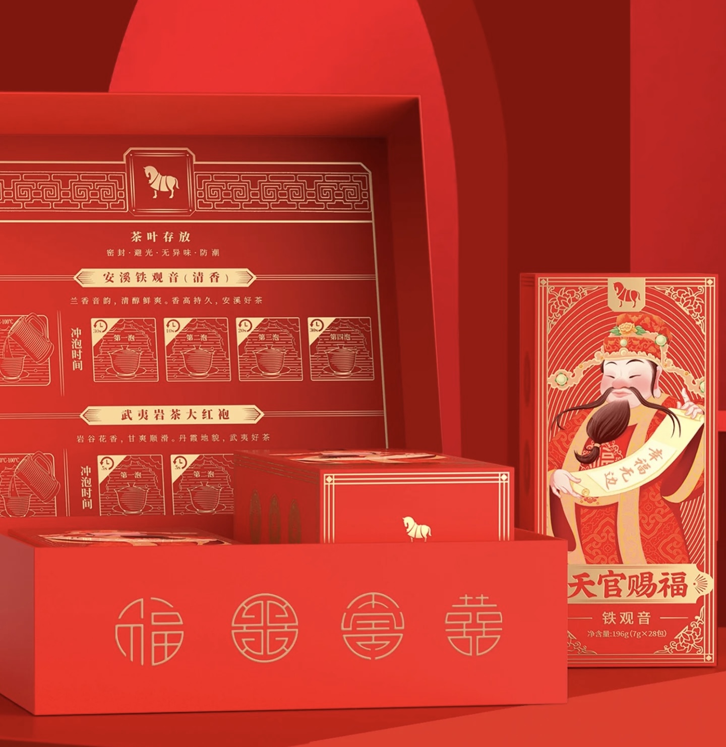 Hộp trà sử dụng tông đỏ – vàng chủ đạo, kết hợp họa tiết: