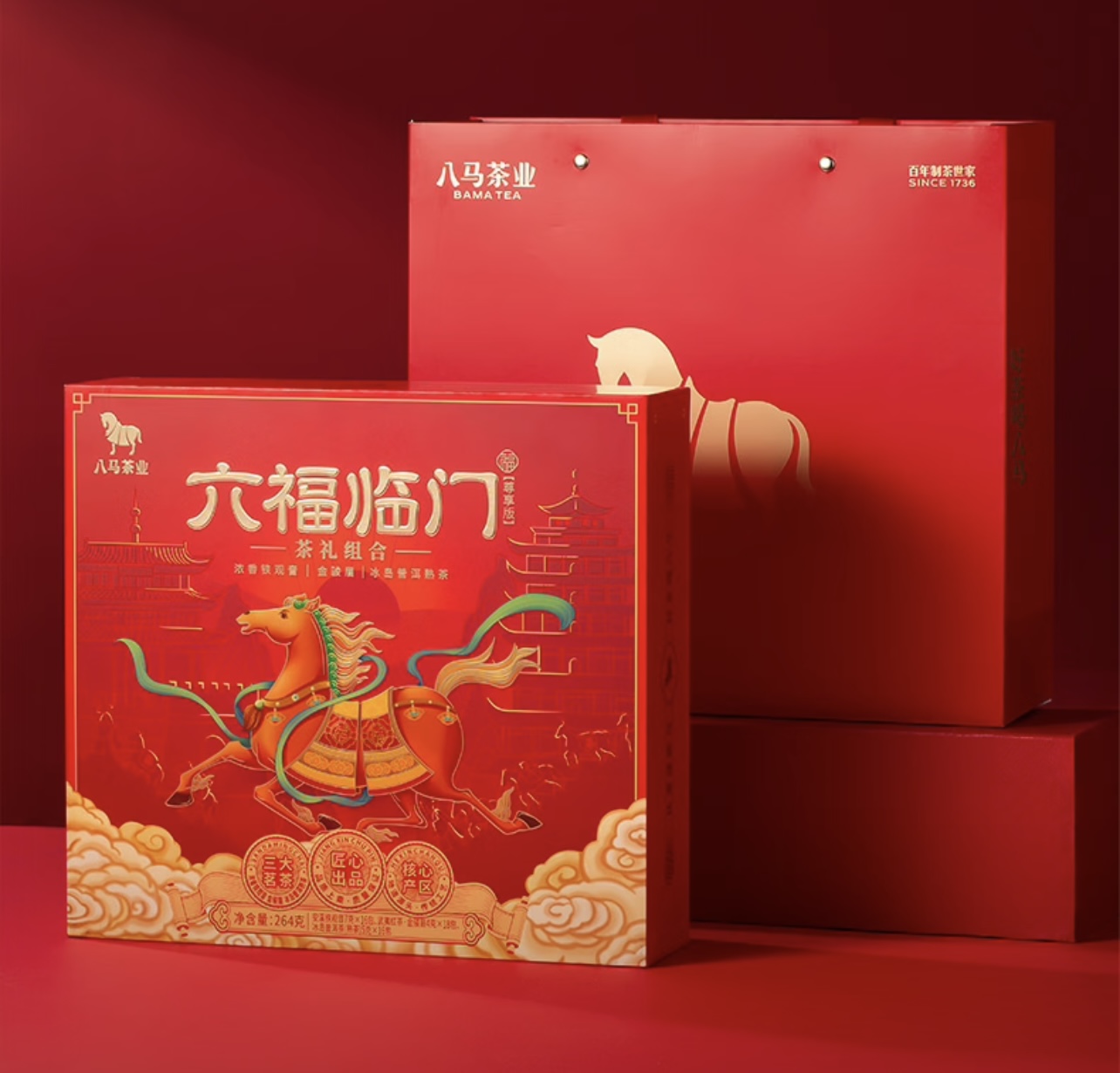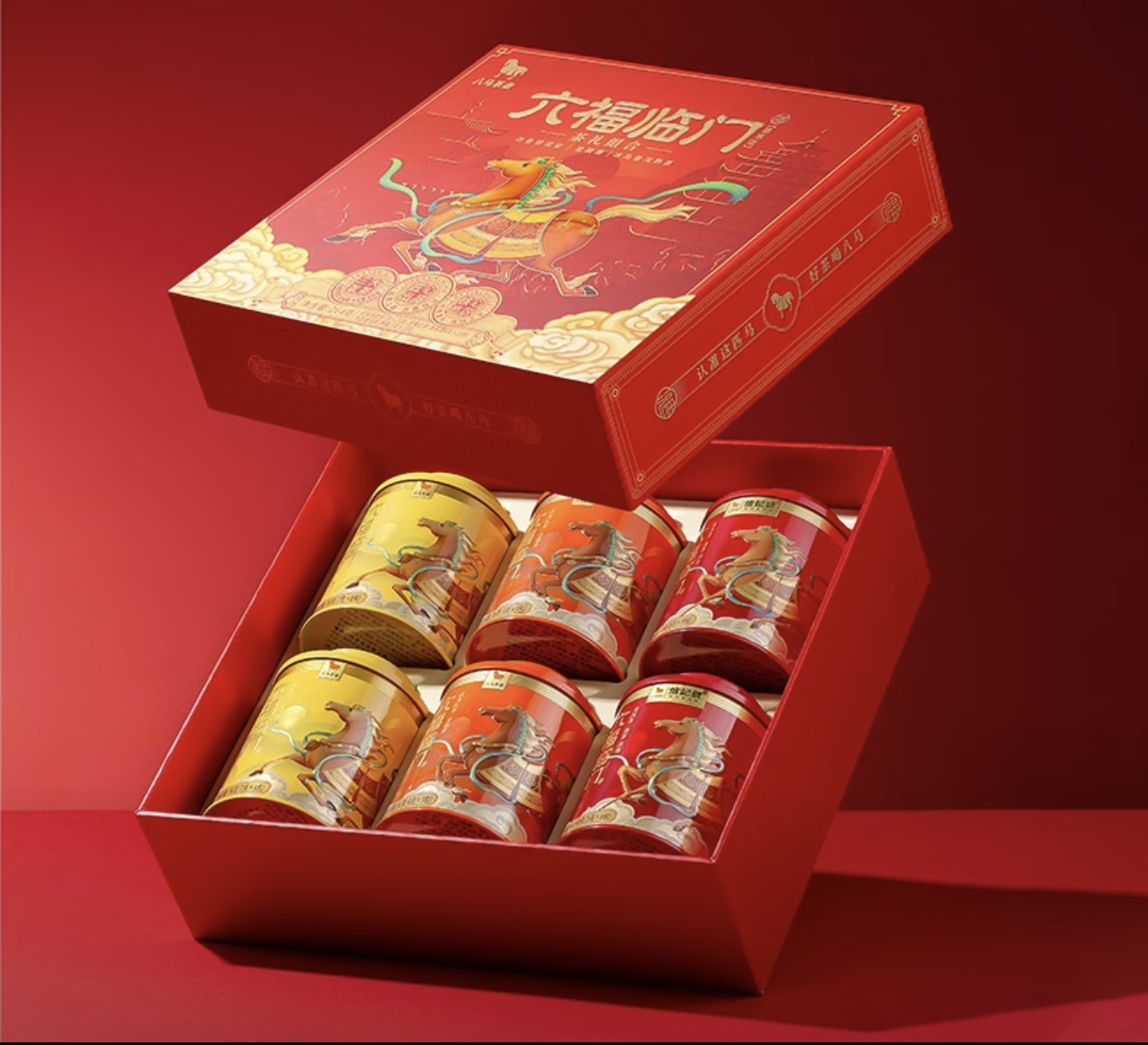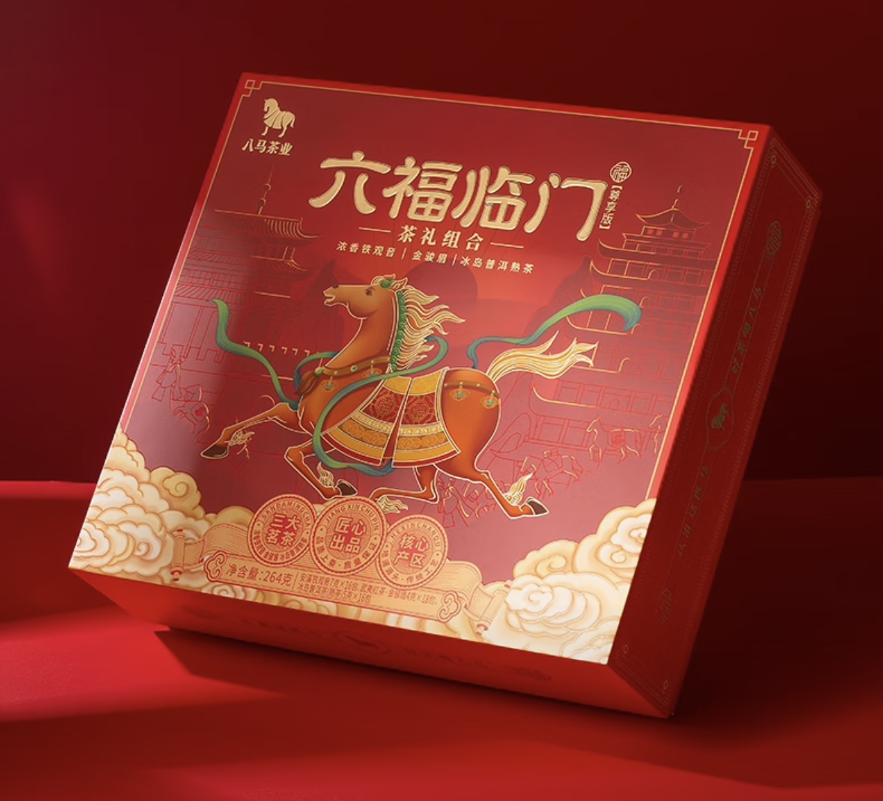 Hộp quà đỏ chủ đạo, biểu tượng Phúc Mã Lâm Môn mang 6 điều phúc lành: