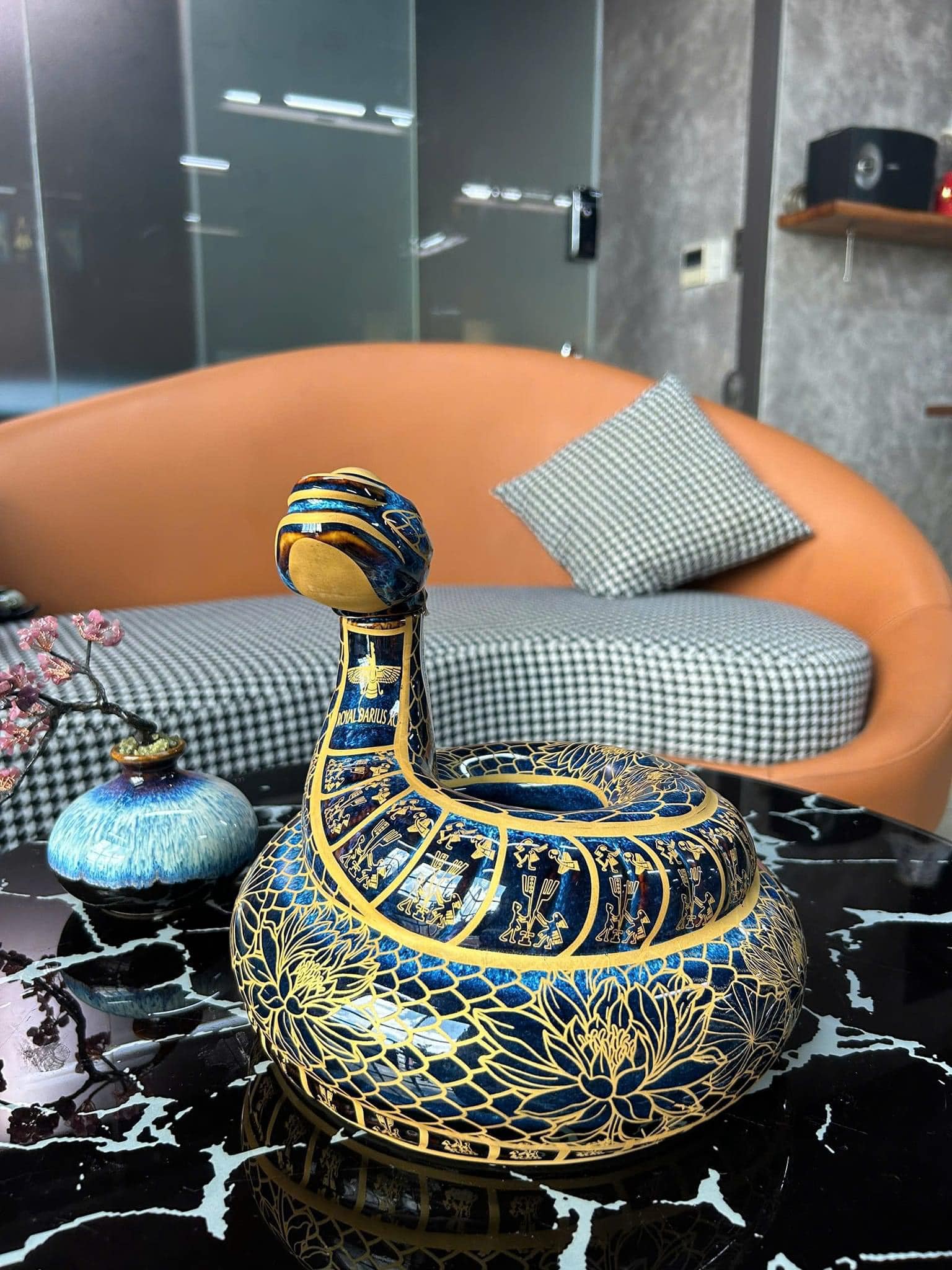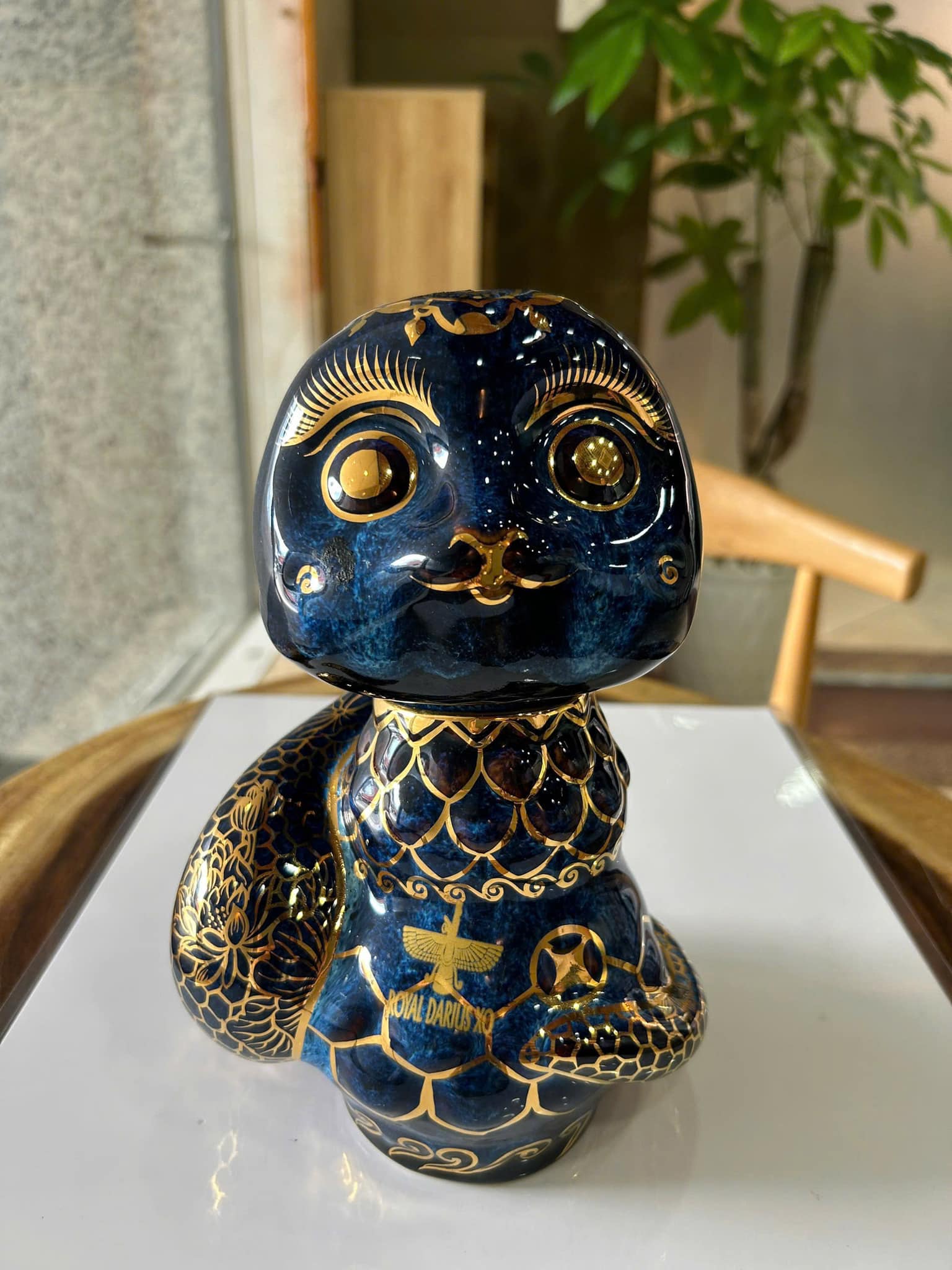 Hình tượng con rắn được chế tác tỉ mỉ từ chất liệu cao cấp, kết hợp với lớp mạ vàng giúp tạo nên sự nổi bật và uy nghi. Những chi tiết vàng ánh kim không chỉ tăng vẻ đẹp cho chai rượu mà còn tượng trưng cho sự giàu sang và phú quý. Đặc biệt, biểu tượng Royal Darius XO khắc trên thân chai như một lời cam kết về chất lượng và đẳng cấp của loại rượu bên trong.